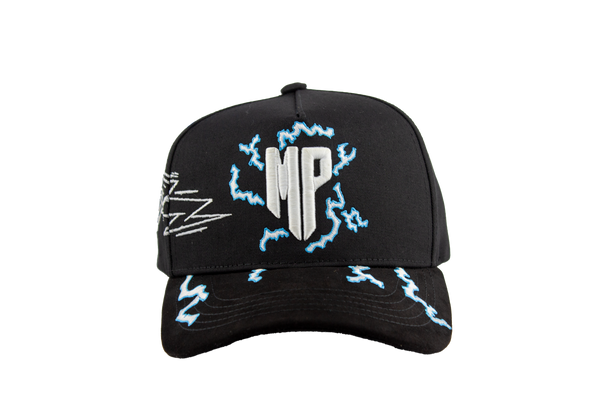 MP Thunder cuenta con el logo MP en el centro en bordado 3D, en un el lateral lleva su serie única en bordado plano de color blanco, y en el otro costado cuenta con un diseño único en bordado plano, en la parte trasera tiene un broche ajustable, así como el logo de la marca en bordado 3D color blanco, la visera es de gamuza, tanto en la parte superior como en la parte inferior, en la parte interior cuenta con forro en satín color azul con el estampado de la marca, la cúpula y el botón superior de la gorra son de gabardina fina.